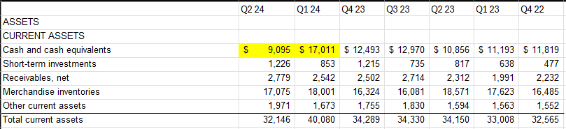 Costco intends to open a total of 15 new locations during the remainder of FY 2024. This most likely explains the drop in cash that they hold from quarter 1 and quarter 2 of FY 2024.