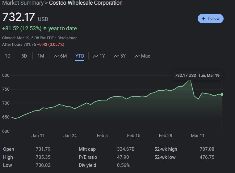 As of 3/19/2024, Costco ($COST) closed at $732.17, but reached an all time high of $787.08 before their Q2 FY 24 earnings report. Letâs break down what happened!