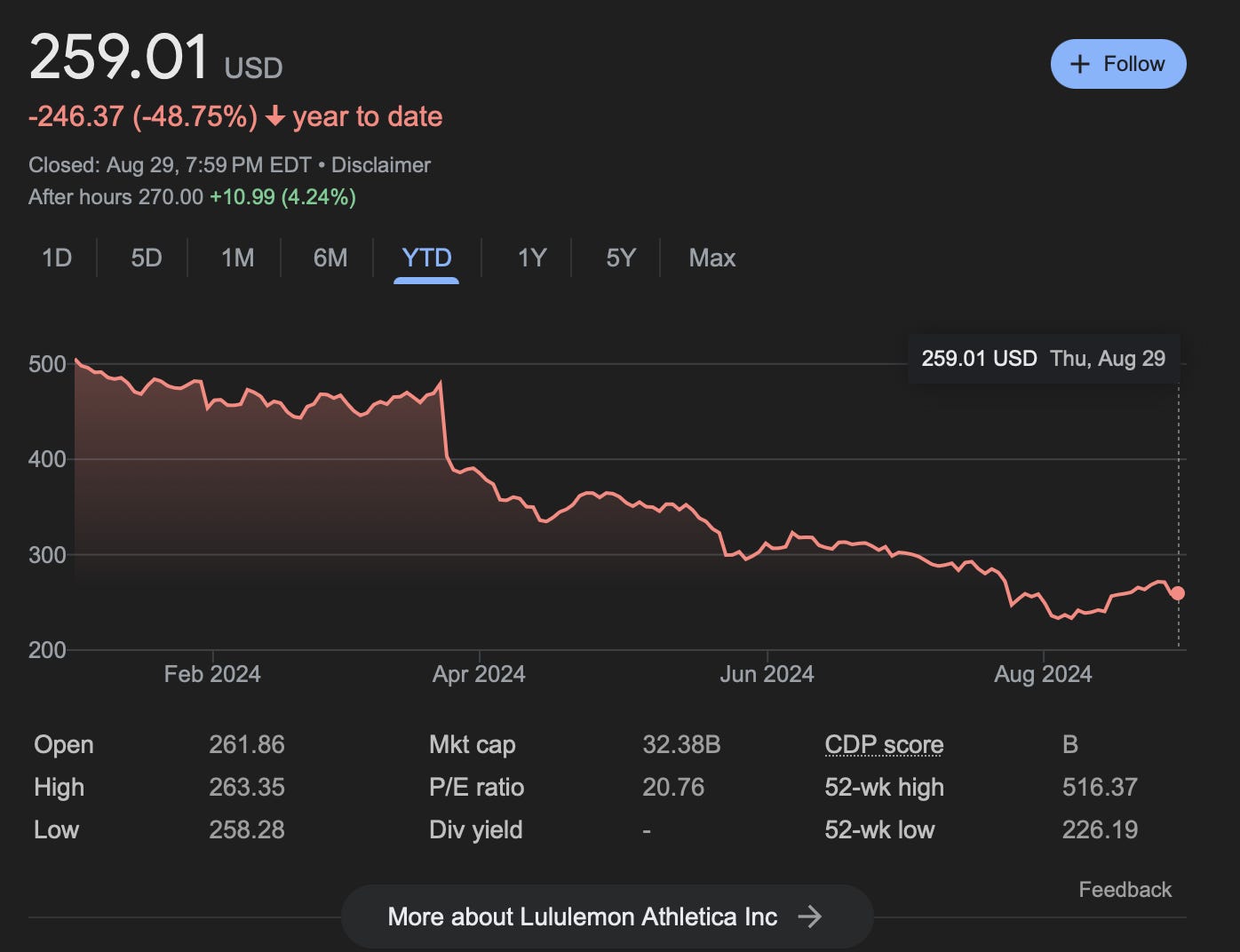 LULU 0.00%↑ also lowered guidance but we’re seeing a boost to their stock price. Keep in mind, the stock is down almost 50% YTD.