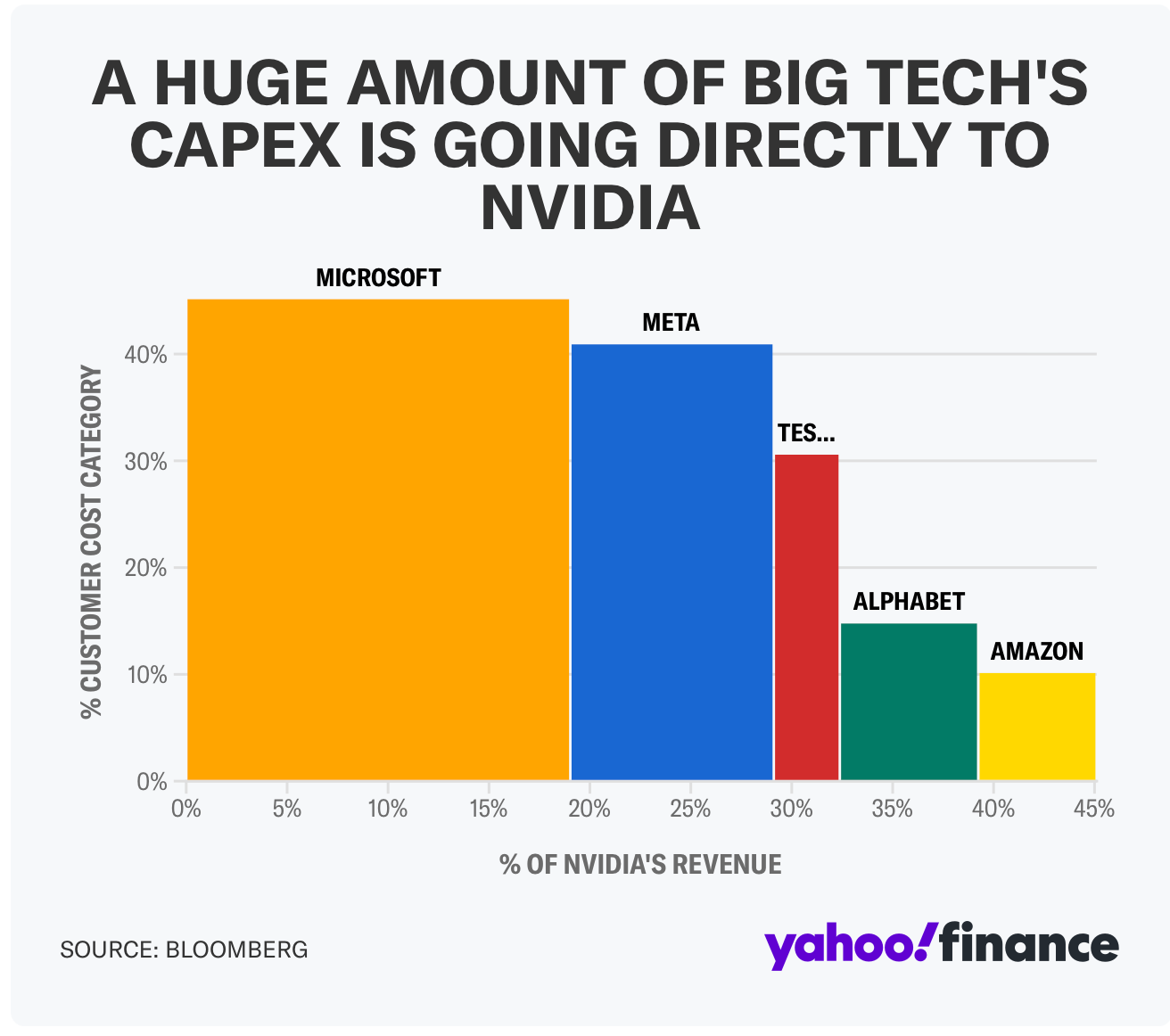 Funny enough, it would take an even crazier beat of expectations for Nvidia’s stock to react positively. Their stock is already up 150% YTD, a 6% pullback is minuscule in the grand scheme of things. I believe Nvidia’s growth is definitely not done in the near future, but maybe closer to to FY2025 and FY2026. Despite AMD 0.00%↑ playing catch up, it’s going to take a while before any company can even come close to competing with Nvidia. Almost half of Nvidia’s revenue is from your favorite tech stocks.