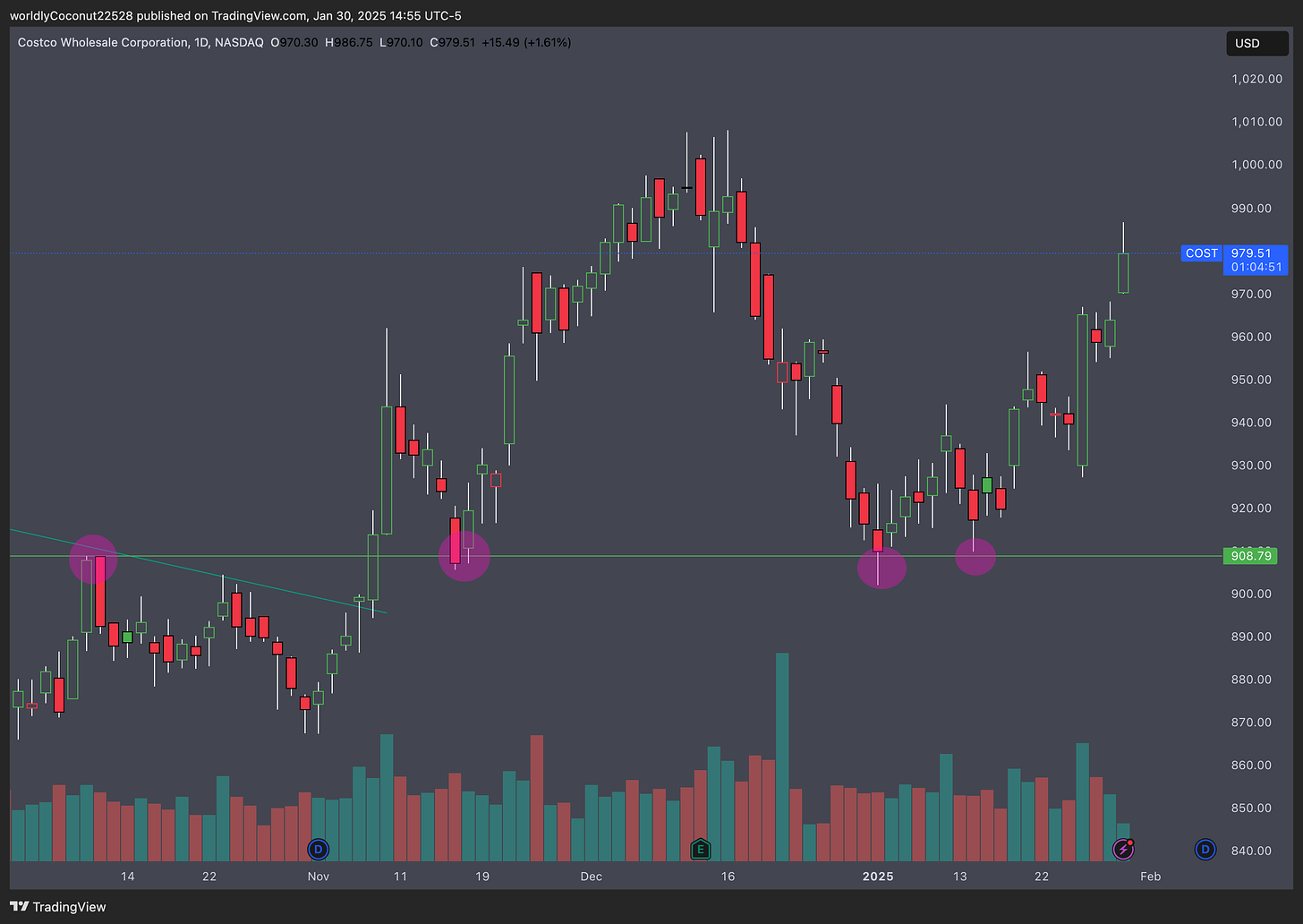This is a great example of resistance for price on the far left, where price rejected pretty aggressively. At that point in time, $908 area was a place where there were more sellers than buyers. After price broke past that resistance point, it become a great support area, where price touched three times and used it as a baseline to bounce back upwards.