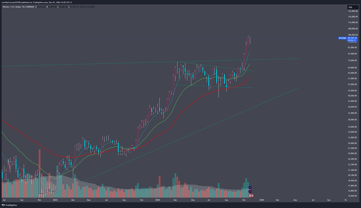 It is with great pleasure that I can say we have broken the weekly flag on Bitcoin that we have been watching for months!! With price just shy of that 100k mental number, I will be excitedly watching for that break over before year end.