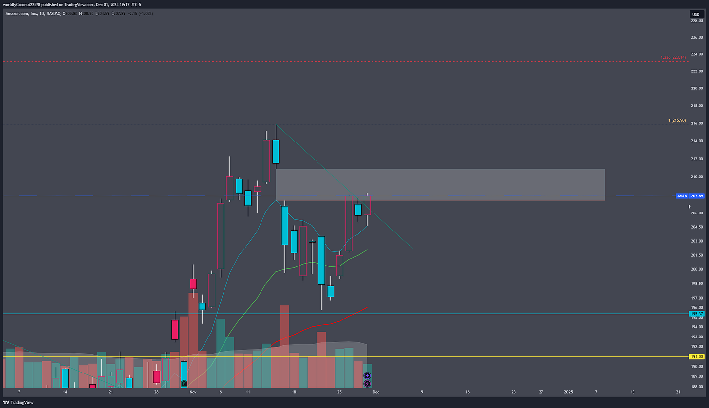 With a strong Friday close, we see two consolidation days right at the cusp of the gap fill to ~$210.83. This name is definitely one to keep a close eye on this week to not only fill the gap but also break ATHs and target $223+