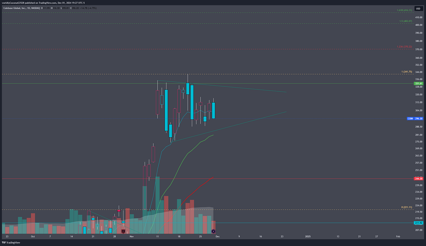 We are seeing dinosaur coins like XRP and LTC waking up, I think all Alts will begin picking up steam to play catchup with Bitcoin. You have to remember that MSTR 0.00%↑ and COIN 0.00%↑ will likely not move that much in tandem. MSTR 0.00%↑ solely holds Bitcoin while COIN 0.00%↑ is a platform for a multitude of coins. Bitcoin weakness with Alt strength benefits COIN 0.00%↑.