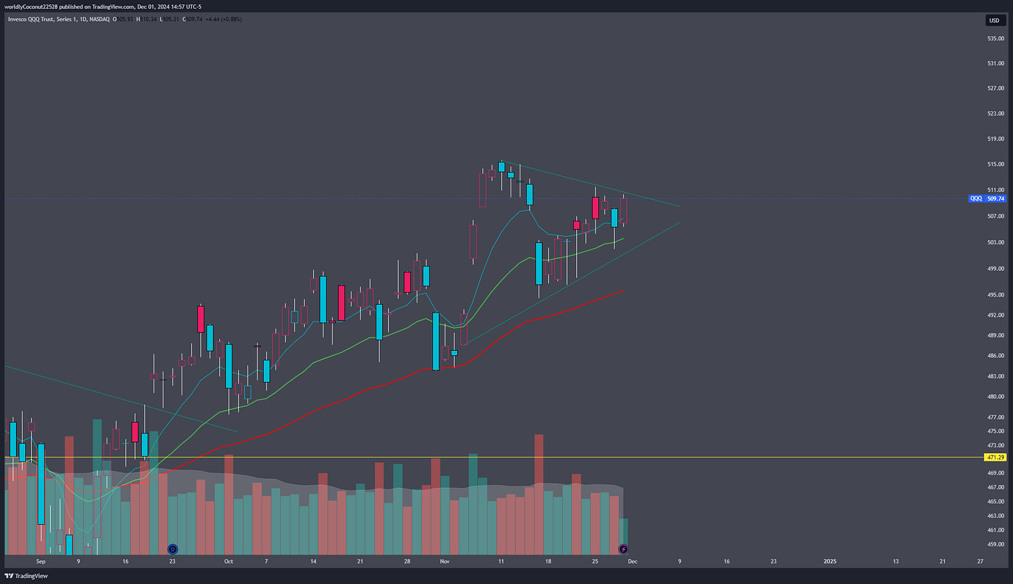 With the Monday after Thanksgiving being historically bearish, it will be interesting to see which direction we break on QQQ 0.00%↑ as we end the year.