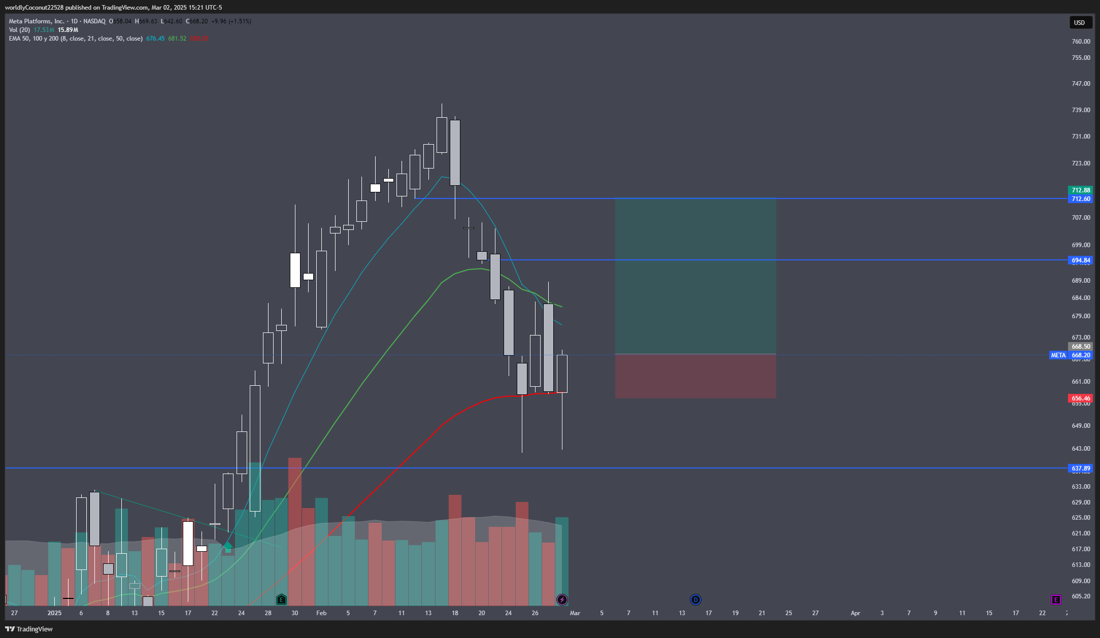 Meta has been clinging onto the daily 50EMA and seems to be holding very well. You could easily long this risking a close under the 50EMA targeting $695, $712. In previous price action, the 50EMA has been respected very well too.