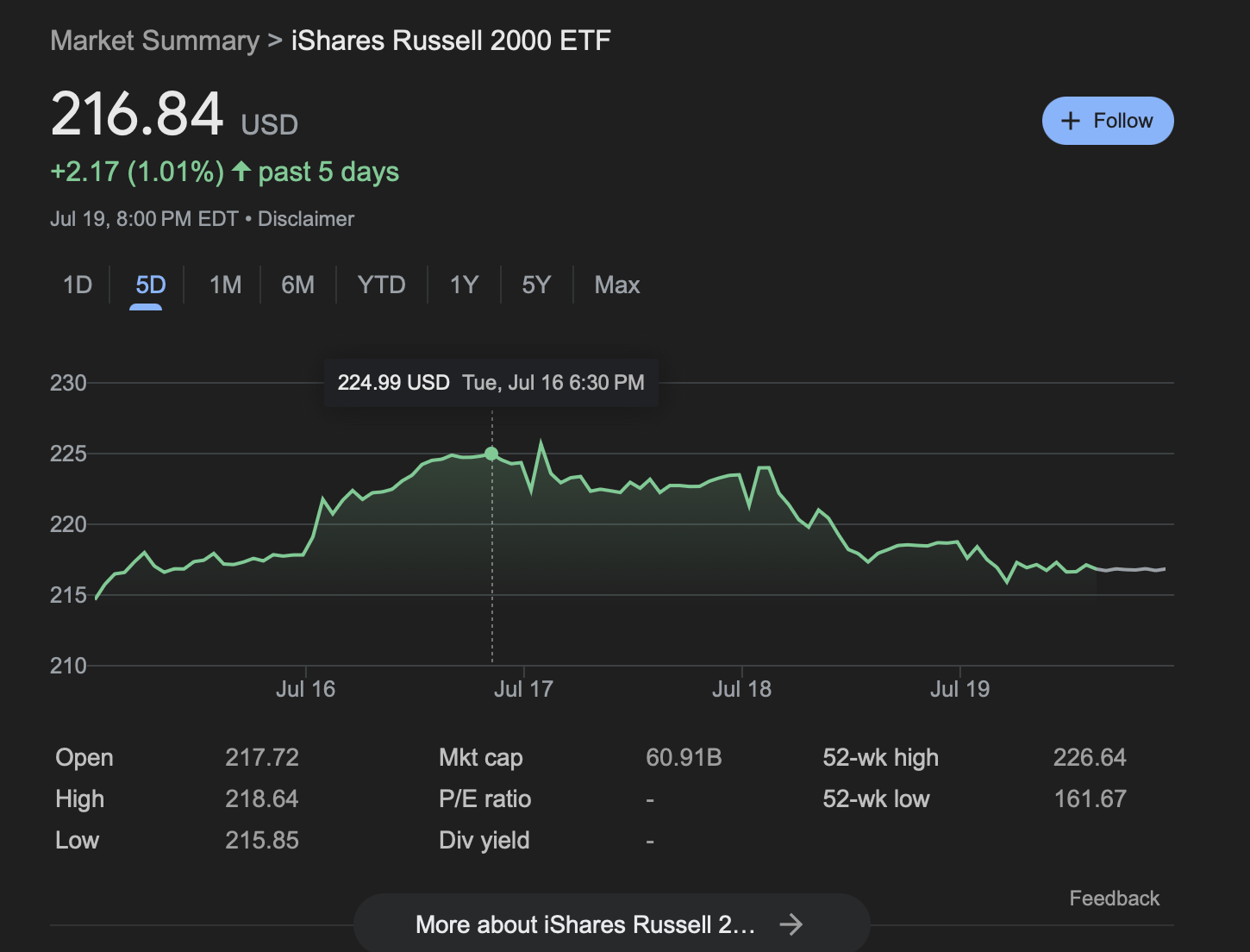 We also saw a continuation of rotation to small cap stocks during the week with IWM 0.00%↑ hitting a peak of around $225/share.