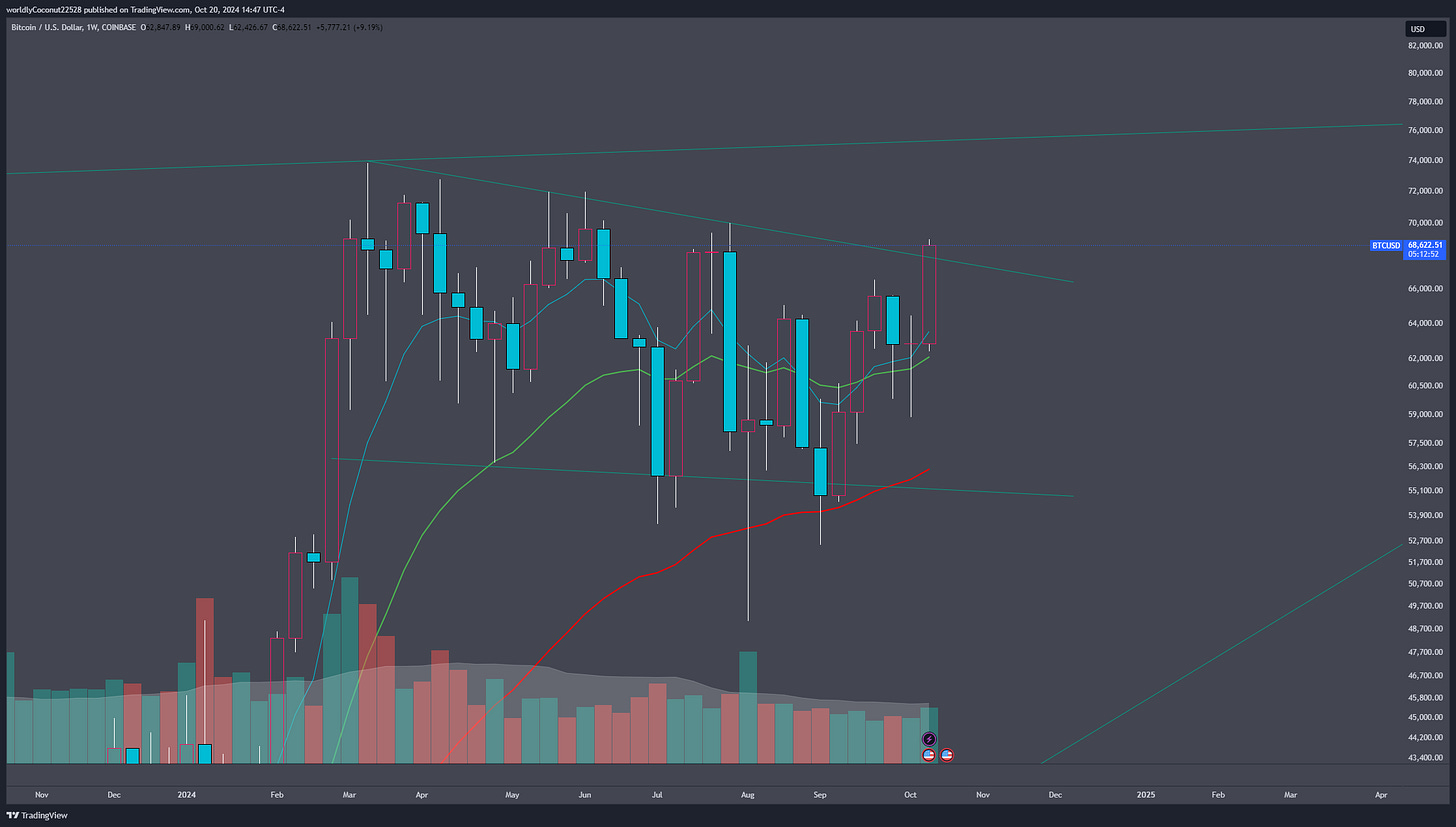 Bitcoin is also now beginning to curl up from the aftereffects of its halving for rewards of mining. From a weekly time frame perspective, you can see below that price is beginning to peak out of its bull flag consolidation. The longer the consolidation always means the more explosive the move will be. I projected end of Q4 2024/beginning of Q1 2025 as peak of Bitcoin for this cycle, and we are now beginning to move favorably to that thesis.
