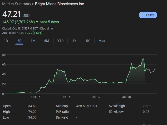 Bright Minds Biosciences went from a market cap of $14 million to over $170 million. Many investors are seeing this move happen because of a short squeeze, which is where option traders are forced to cover their shorts by buying the stock. It’s funny because Bright Minds Biosciences is still in pre-revenue and haven’t brought a single drug to the market yet.